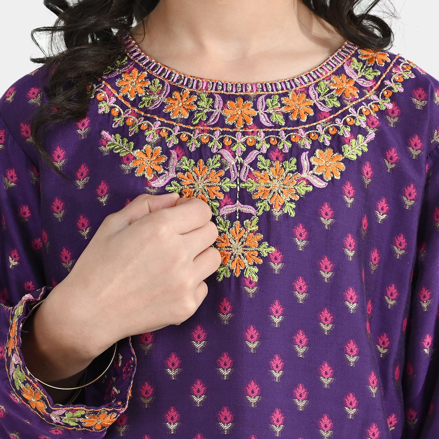 Girls' purple cotton jacquard 2-piece set featuring a round-neck, sleeveless top with embroidery detailing and matching bottoms, perfect for a stylish and comfortable everyday look.