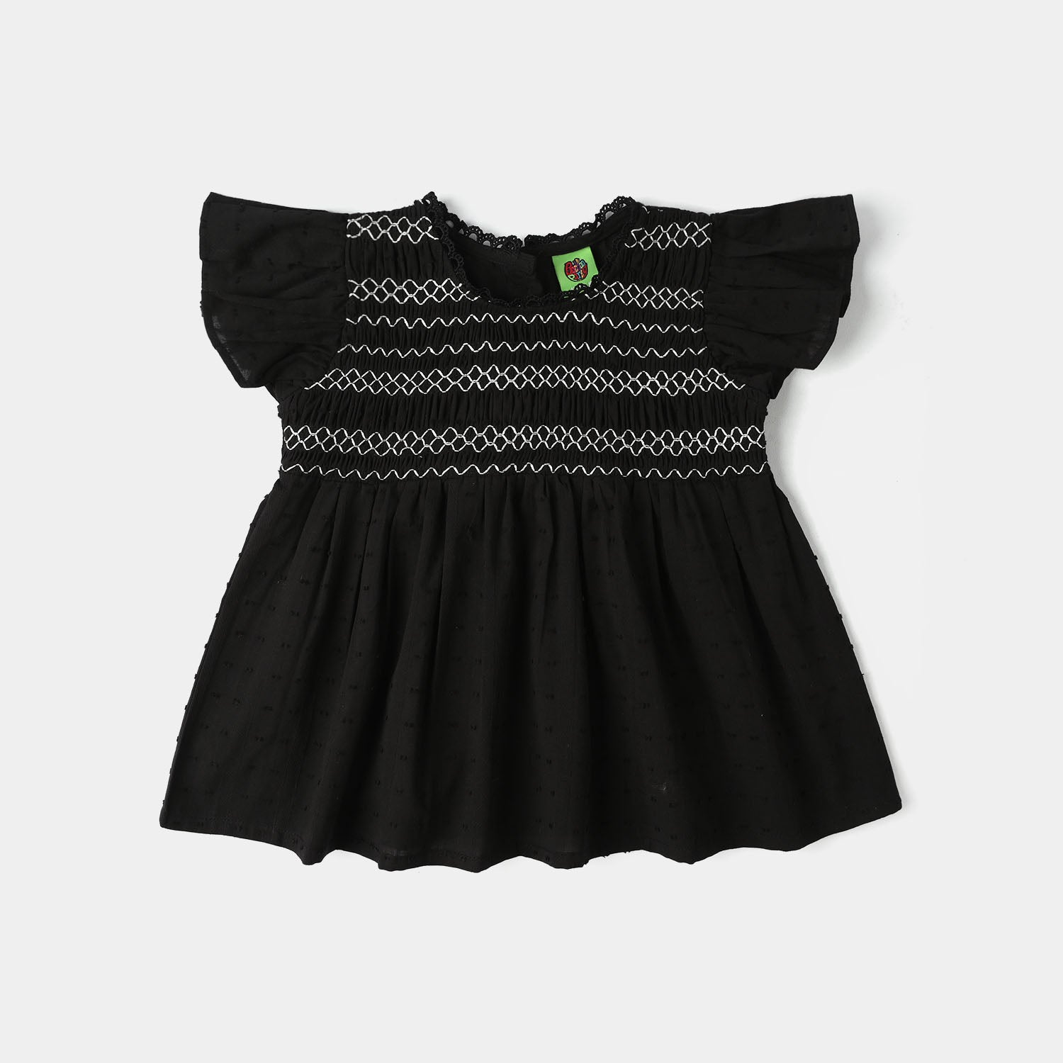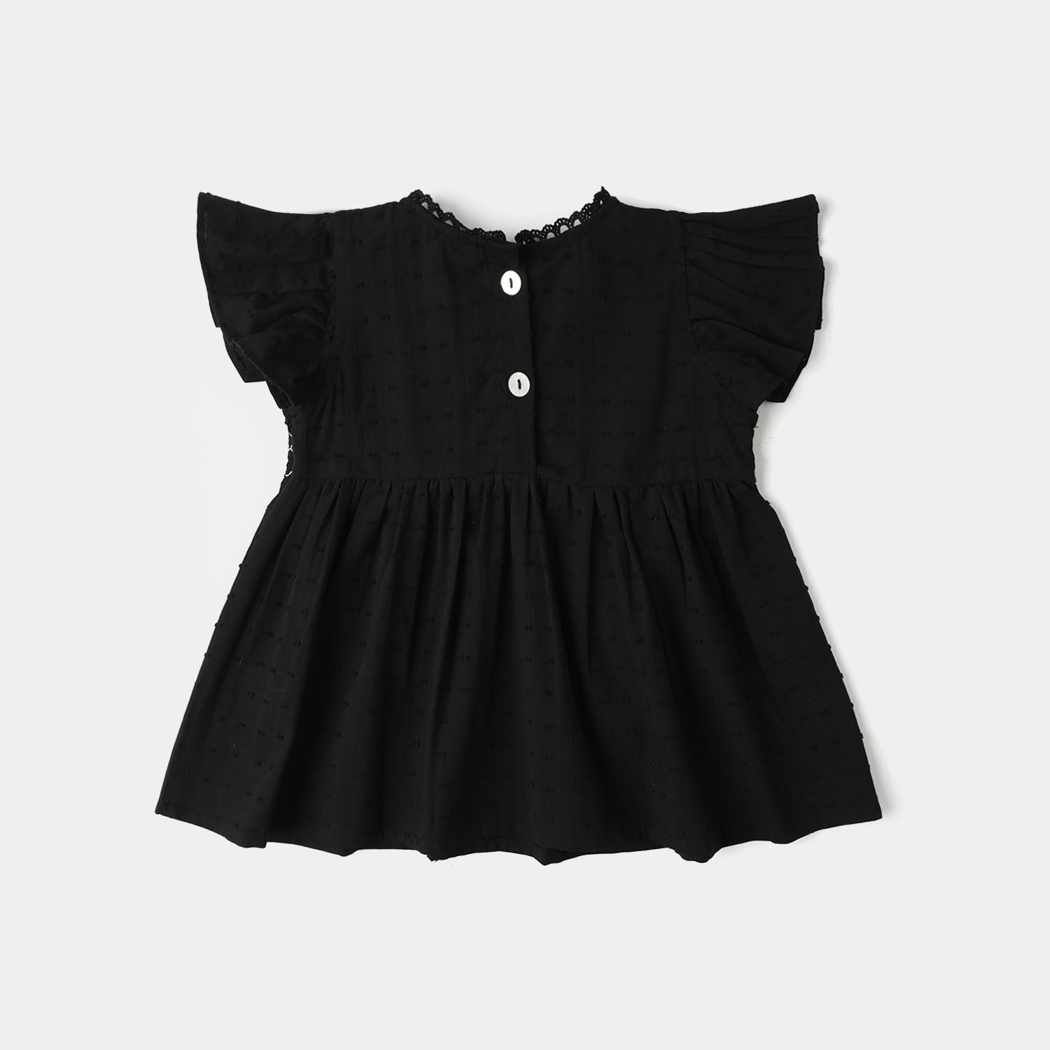 Infant girls' black jacquard casual frock top featuring a round neck with lace detailing, half frilled sleeves, and pleated design, perfect for a stylish and comfortable everyday look.
