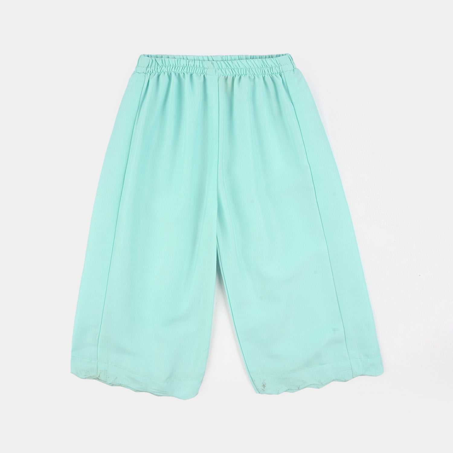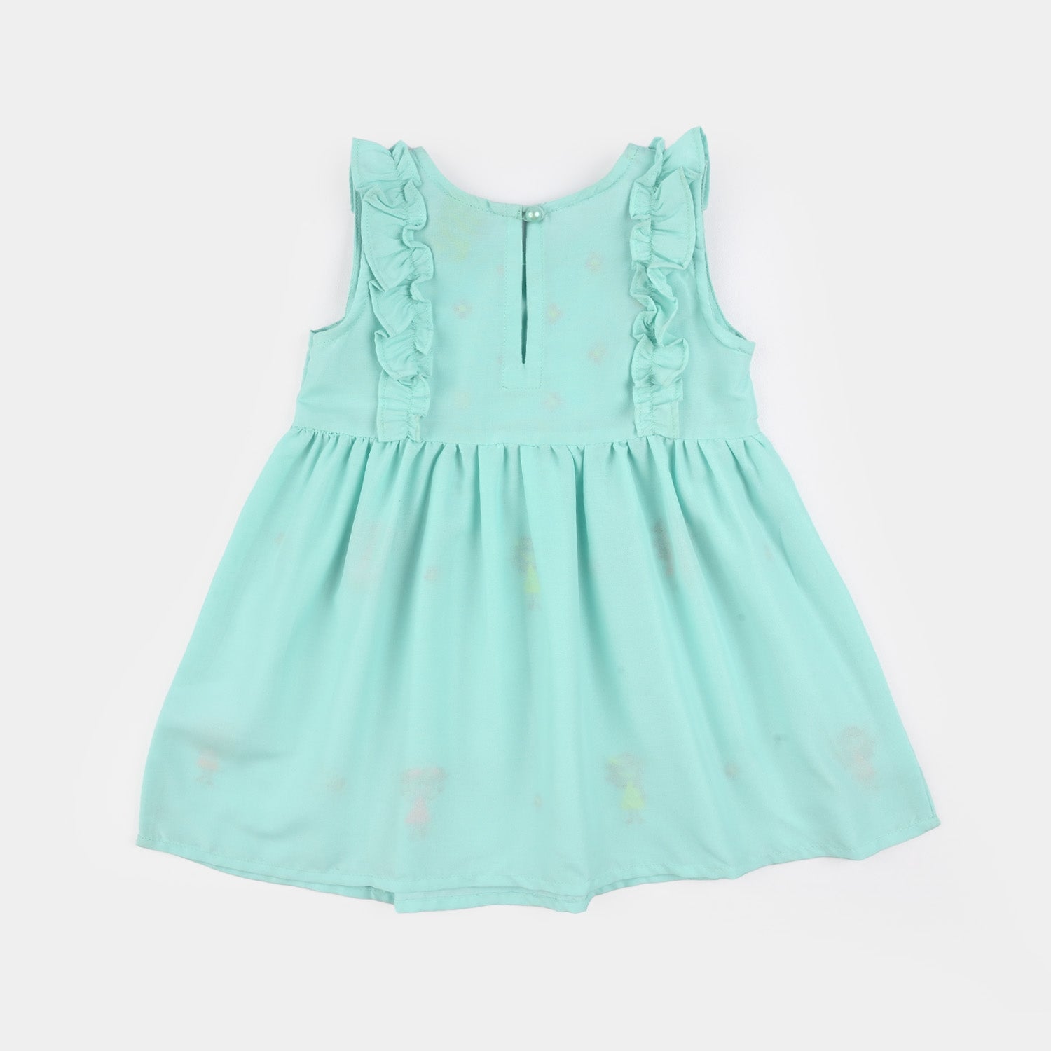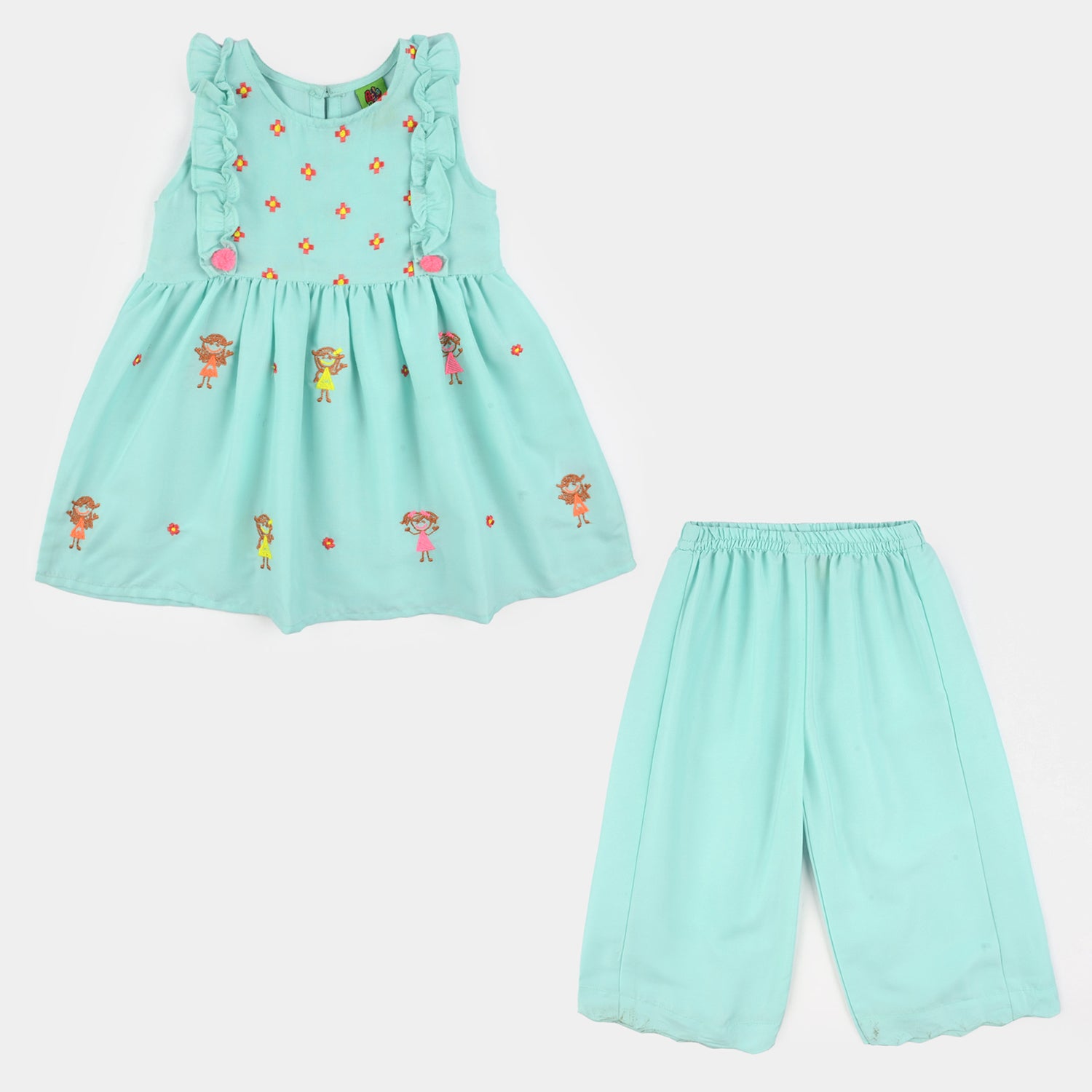 Infant girls' mint green poly cambric 2-piece set featuring an embroidered sleeveless frock with round neck, ruffle, and pleat detailing, paired with matching culottes, perfect for a cute and comfortable everyday look.