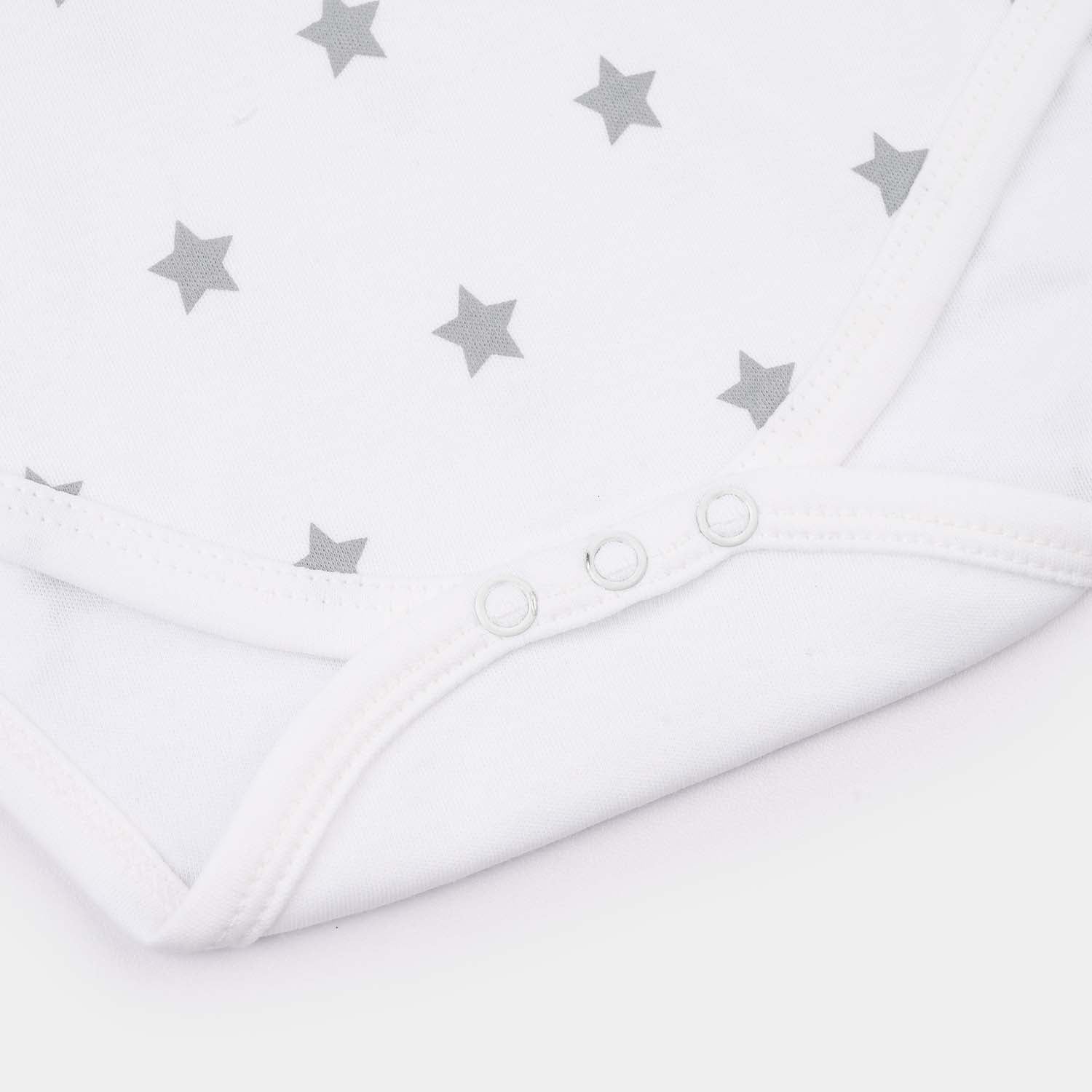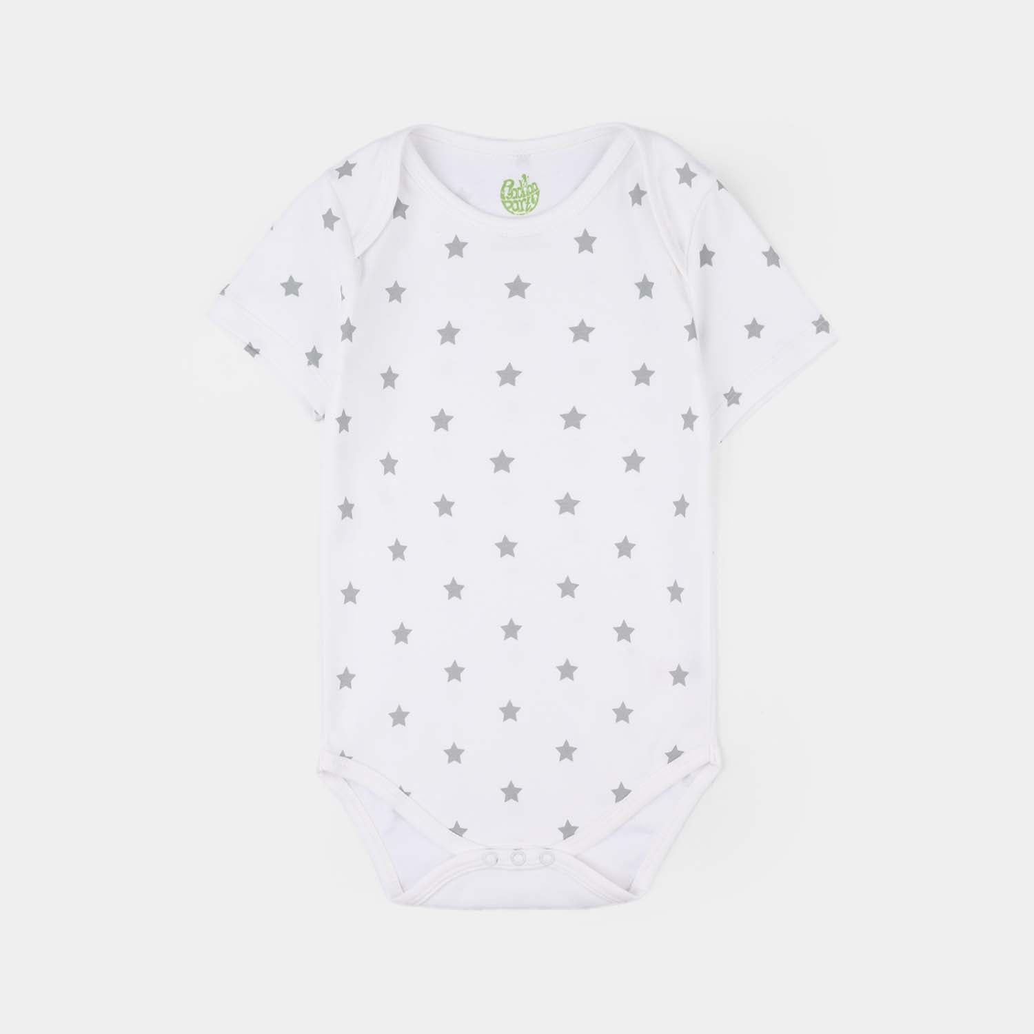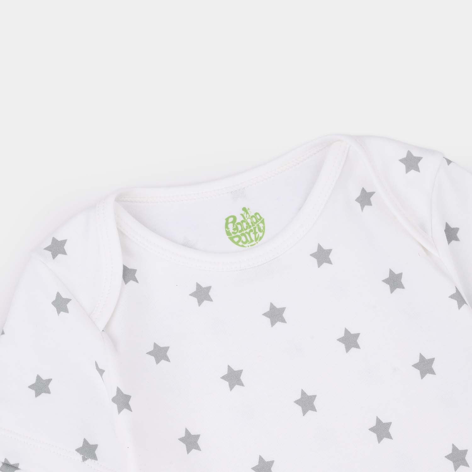 Infant unisex white cotton interlock romper featuring a round neck, half sleeves, and all-over star print, perfect for soft and comfortable everyday wear.