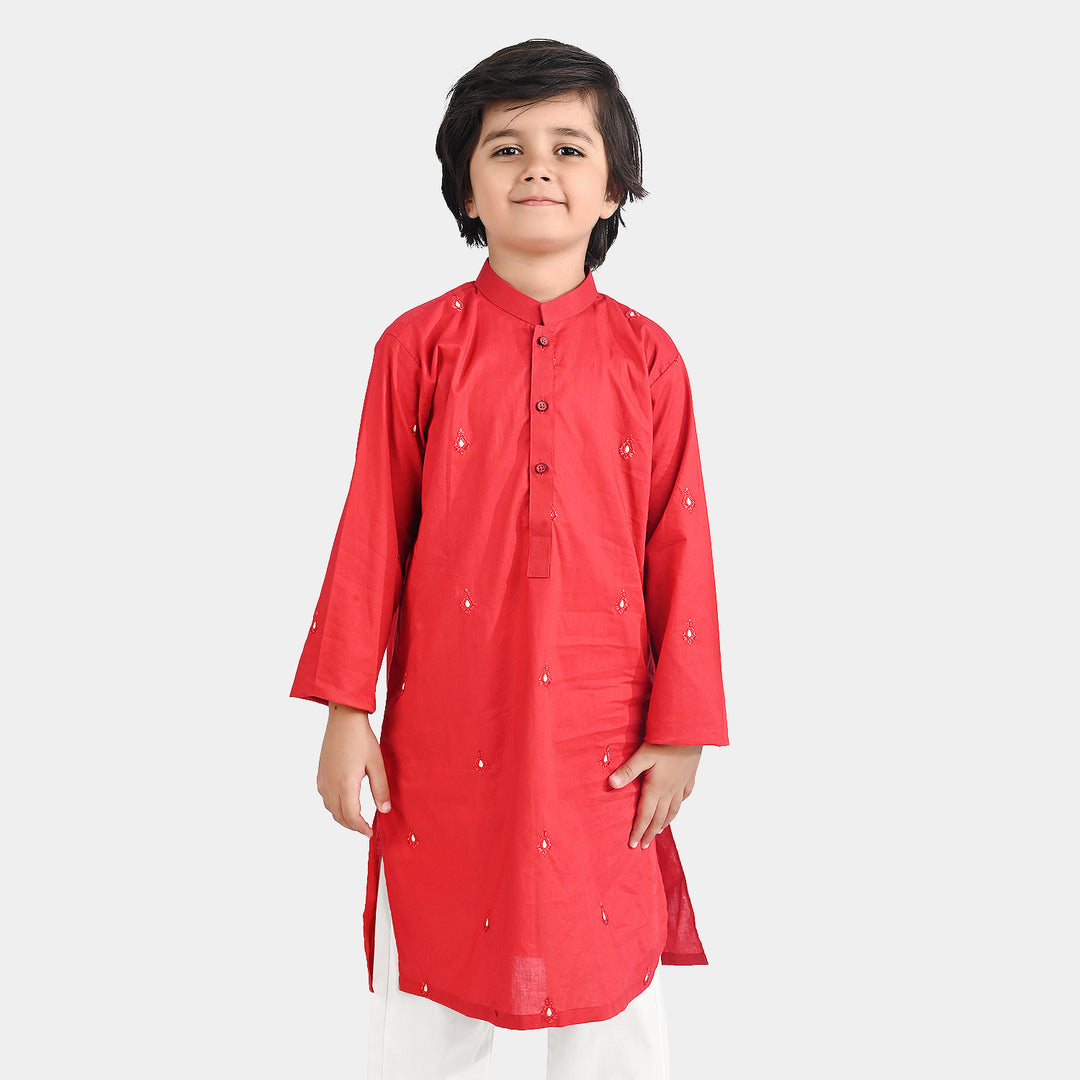 Boys Cotton Poplin Embroidered Kurta (Ornamental)-Red