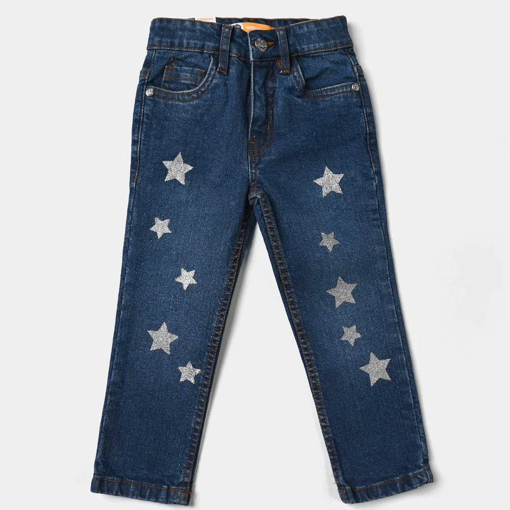 Girls Denim Stretch Pant Glitter Star-Mid Blue