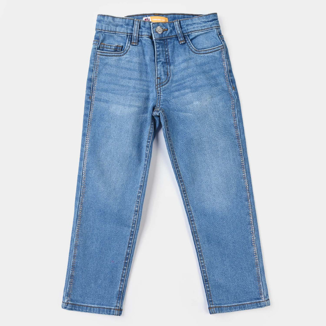 Girls Denim Stretch Pant Studs one Side-Mid Blue