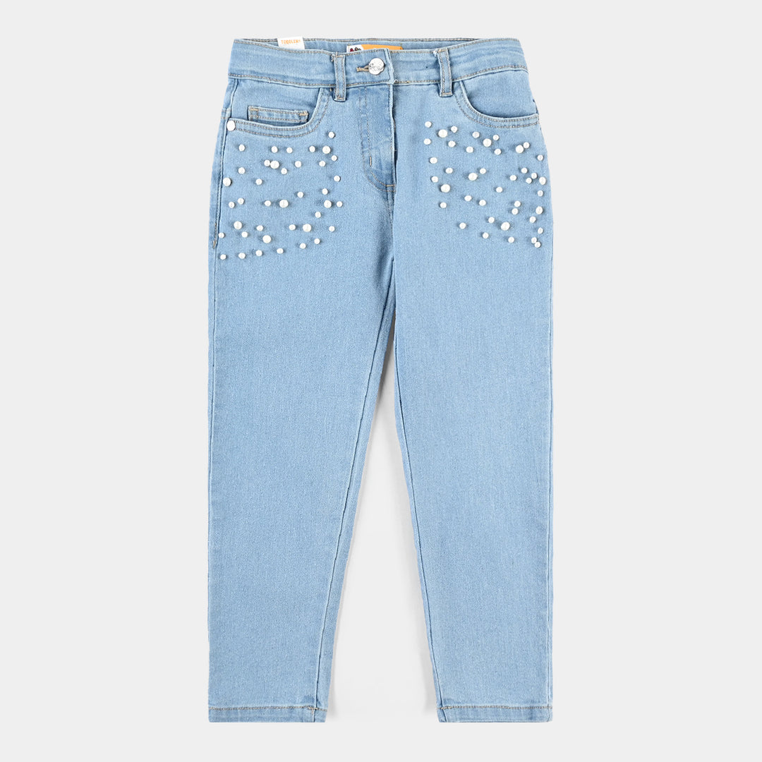 Girls Denim Stretch Pant Big Pearls-Ice Blue