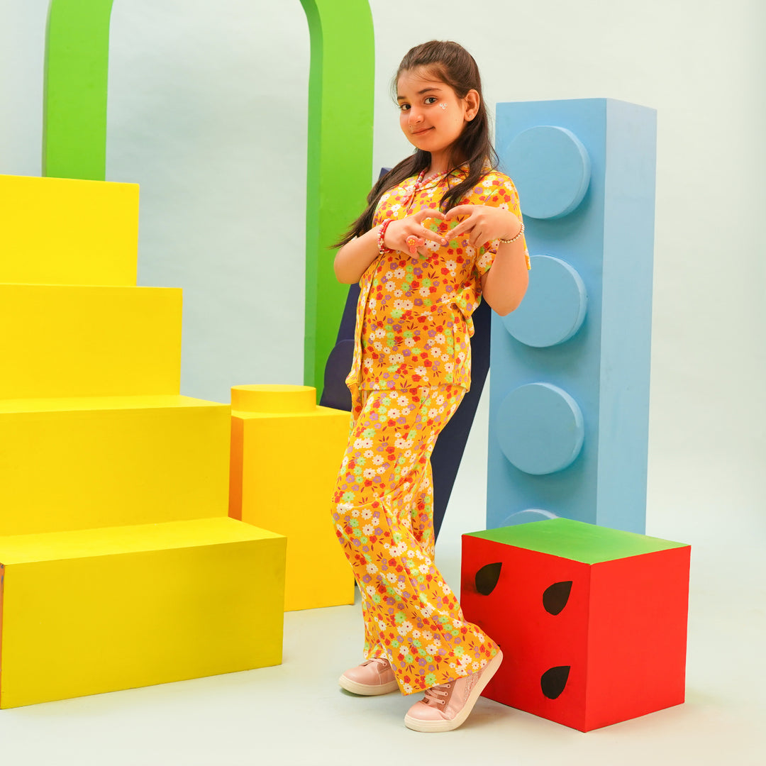 Girls Cotton Poplin Co-Ord Set Water Color-YELLOW