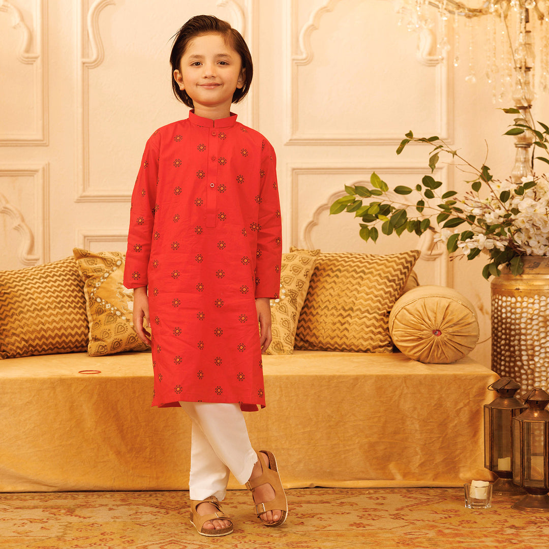 Boys Cotton Poplin Printed Kurta (Puff Motif)-Red