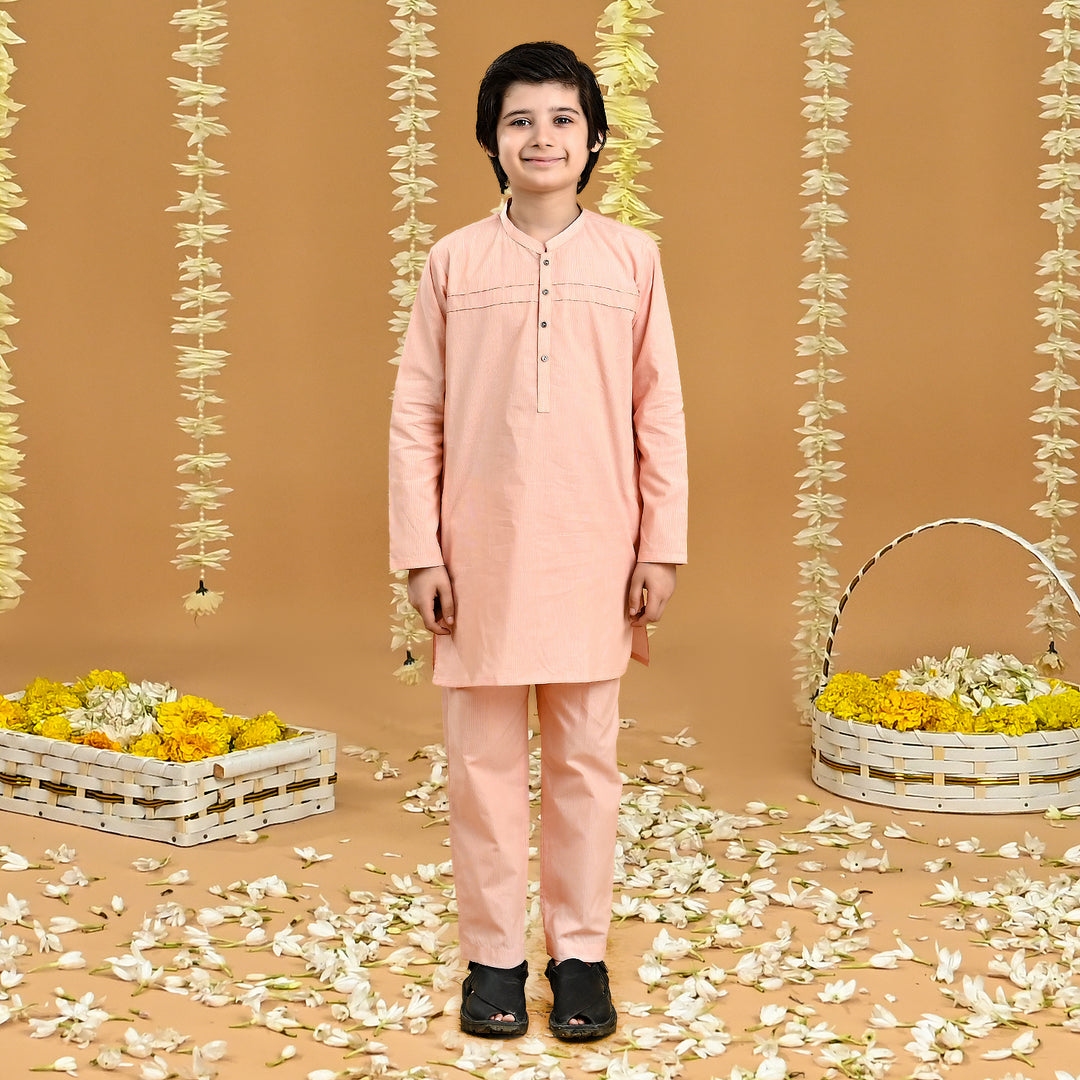 Boys Yarn Dyed Shalwar Suit (Front Pleat)-Peach