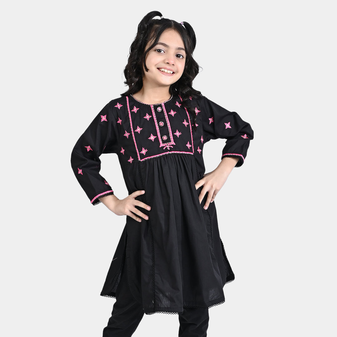 Girls Cotton Poplin EMB Long Kurti Surma-BLACK