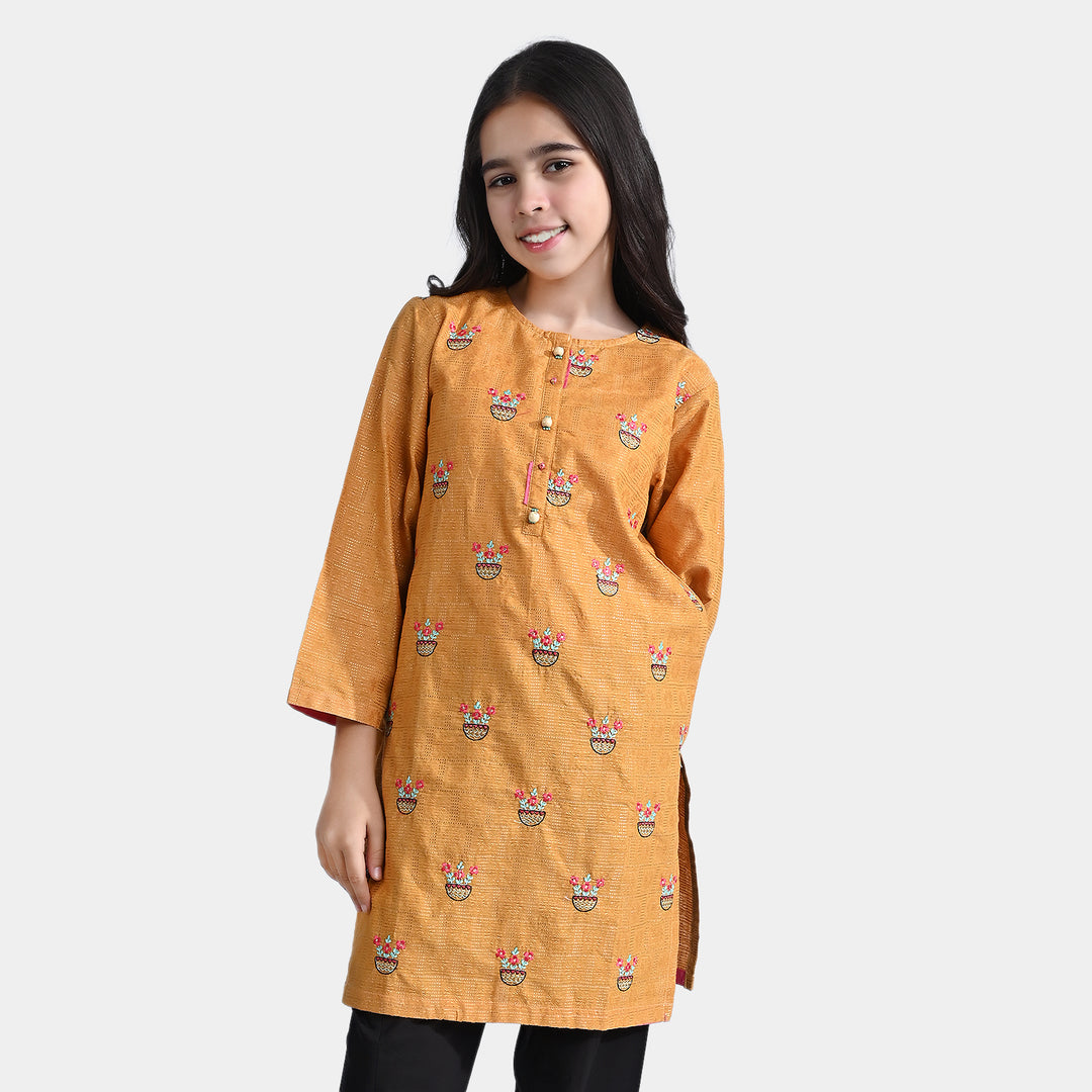 Girls Cotton Slub Embroidered Kurti Glimmer-Mustard