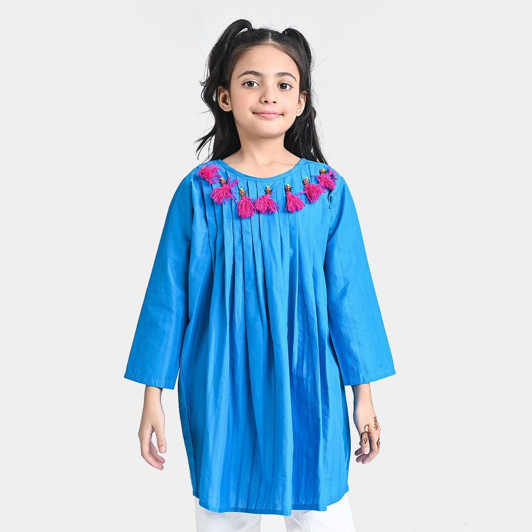 Girls Jacquard Kurti Hanging Tassels-Teal blue
