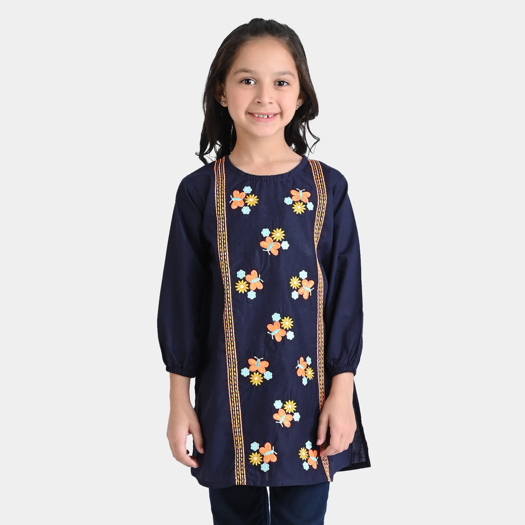 Girls Cotton Slub EMB Kurti Butterflies-Navy Blue